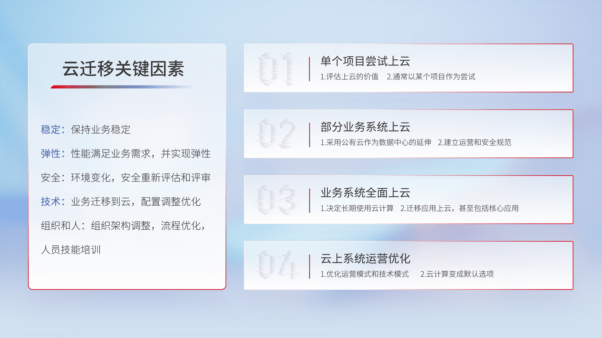 结合实际业务,,,,从规划设计、、、云平台选型、、、云原生改造、、、、数据迁移、、、、集成交付,,,迁移全过程为客户识别最佳上云路径,,,做好风险识别管理,,,,设计网络架构、、、、身份权限、、、安全审计合规、、操作审计、、、日志审计、、、监控告警策略、、多站点容灾设计等,,,对云上基础设施进行整体规划,,,提升IT治理水平,,以满足弹性、、、高可用、、高性能的需求。。